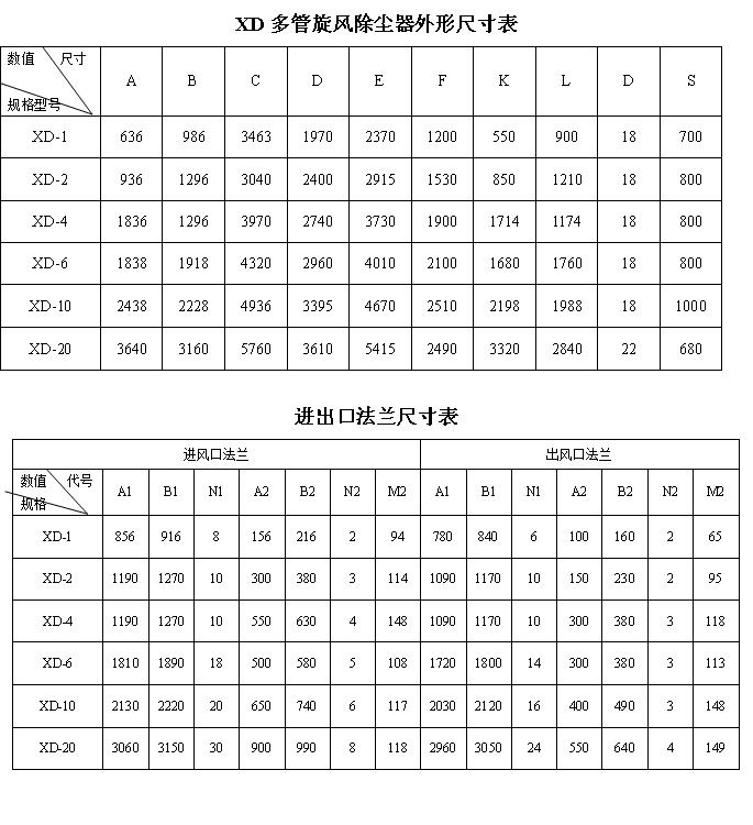 一、XD型多管高效旋風(fēng)除塵器技術(shù)數(shù)據(jù)表: